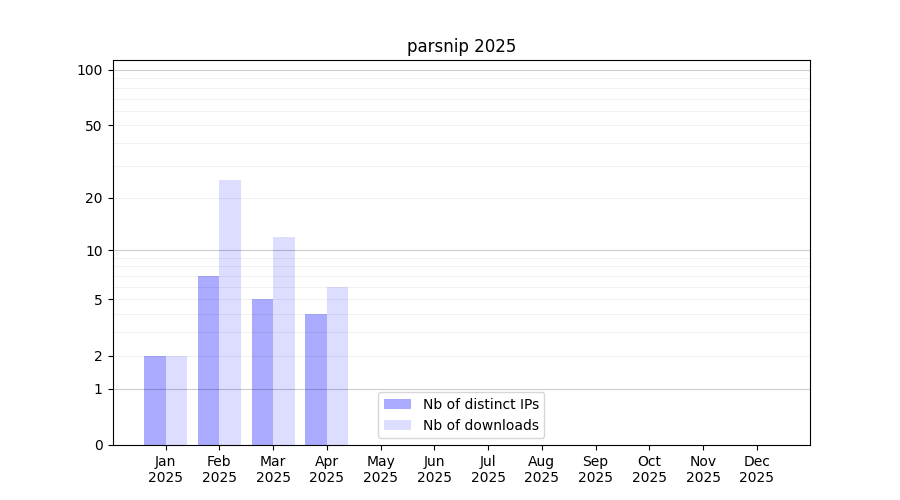 Number of downloads for software package parsnip, year by year, from 2025 back to 2014 (years with no downloads are omitted):