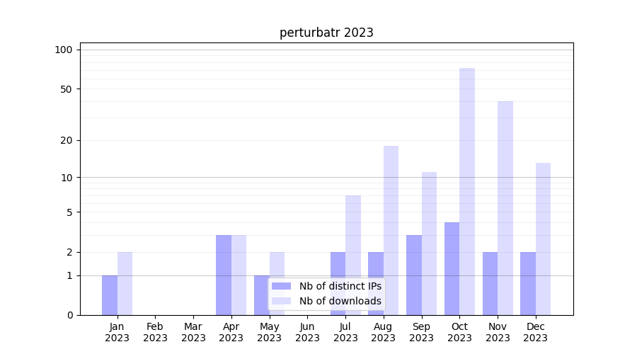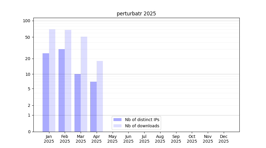Number of downloads for software package perturbatr, year by year, from 2025 back to 2014 (years with no downloads are omitted):