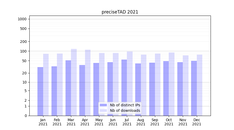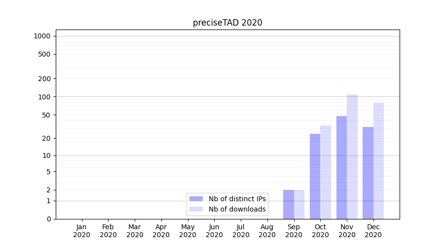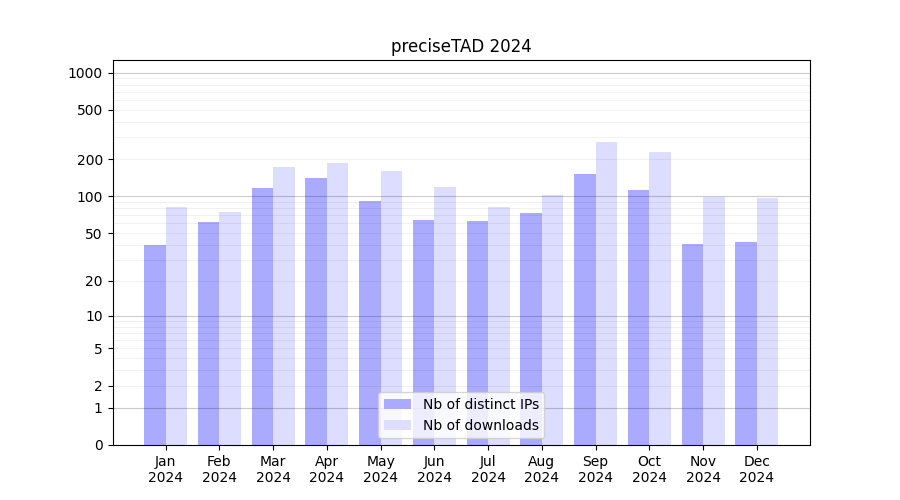 Number of downloads for software package preciseTAD, year by year, from 2025 back to 2014 (years with no downloads are omitted):