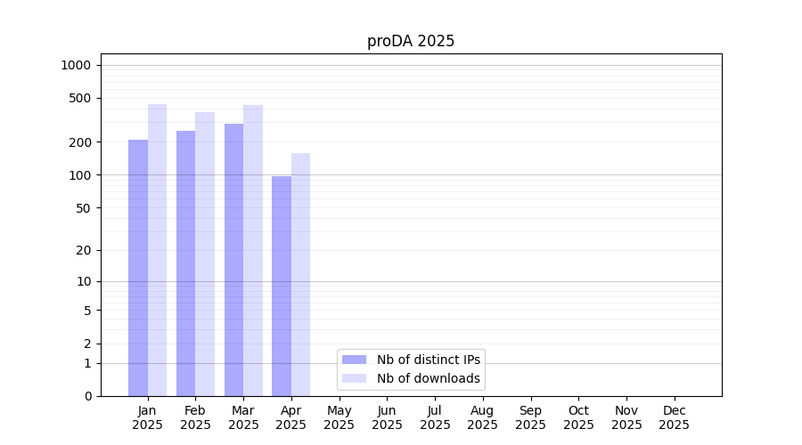 Number of downloads for software package proDA, year by year, from 2025 back to 2014 (years with no downloads are omitted):