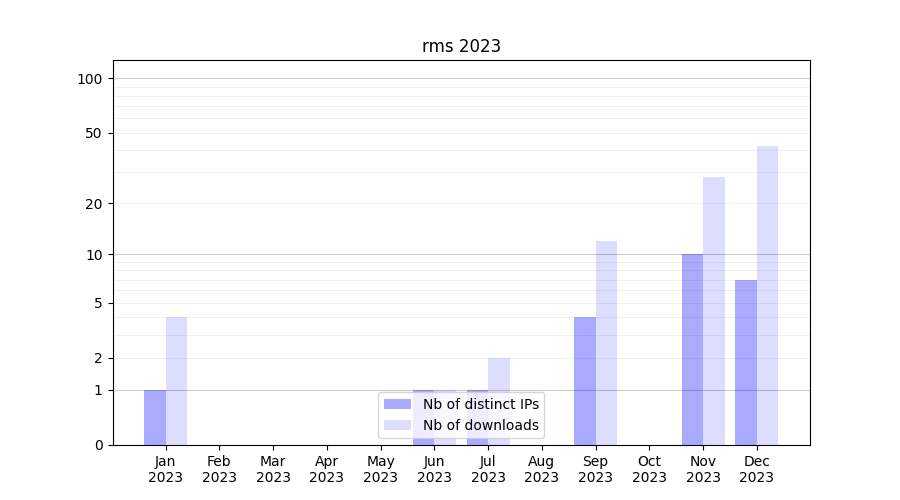 Number of downloads for software package rms, year by year, from 2025 back to 2014 (years with no downloads are omitted):