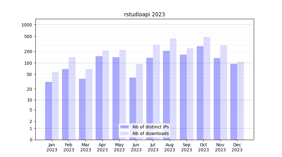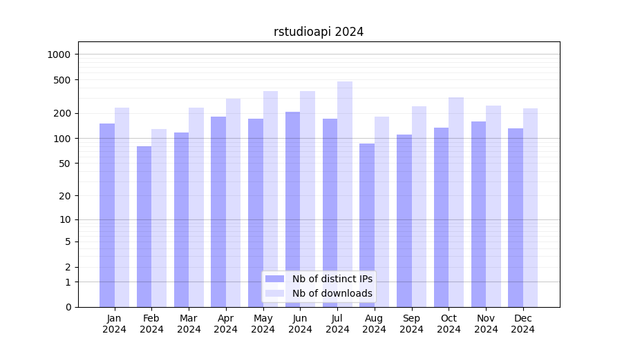 Number of downloads for software package rstudioapi, year by year, from 2025 back to 2014 (years with no downloads are omitted):