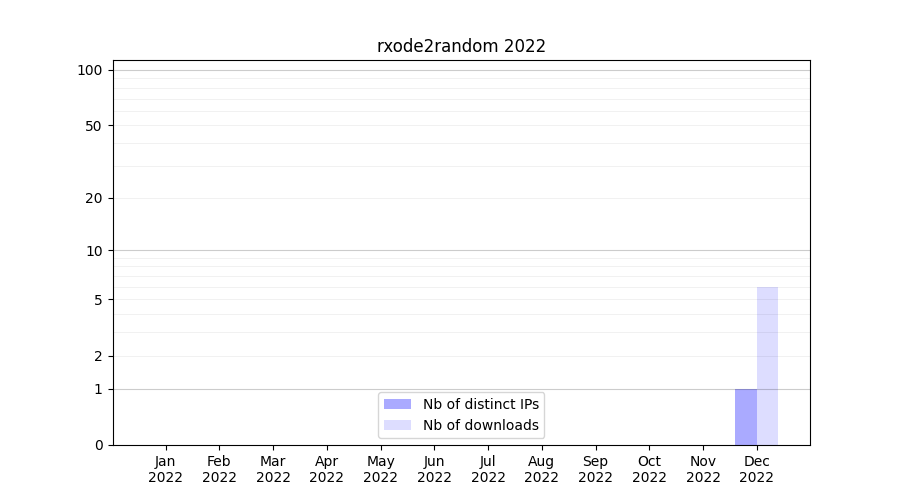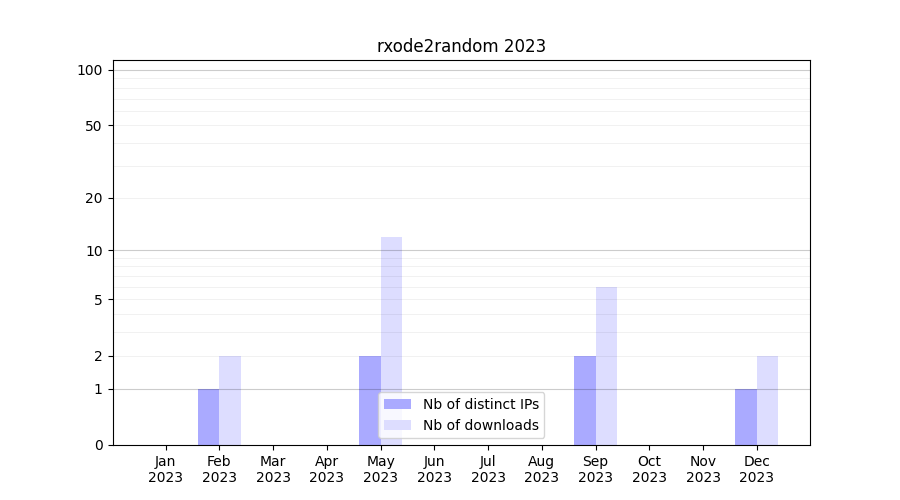 Number of downloads for software package rxode2random, year by year, from 2025 back to 2014 (years with no downloads are omitted):