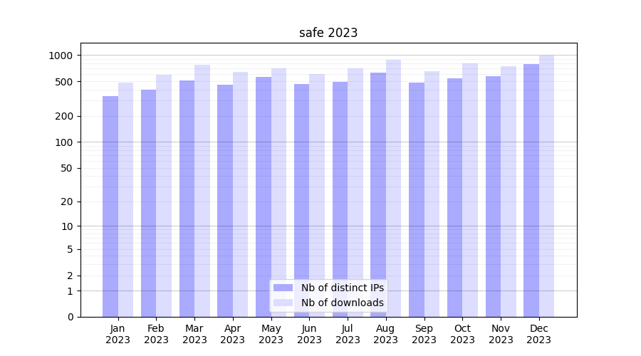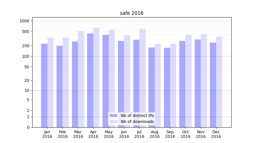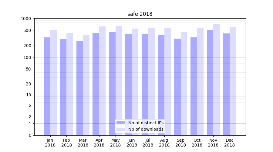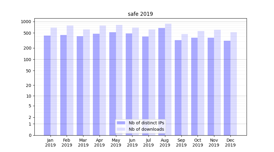 Number of downloads for software package safe, year by year, from 2025 back to 2014 (years with no downloads are omitted):
