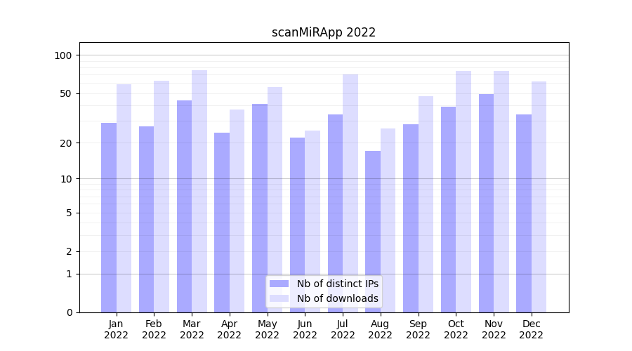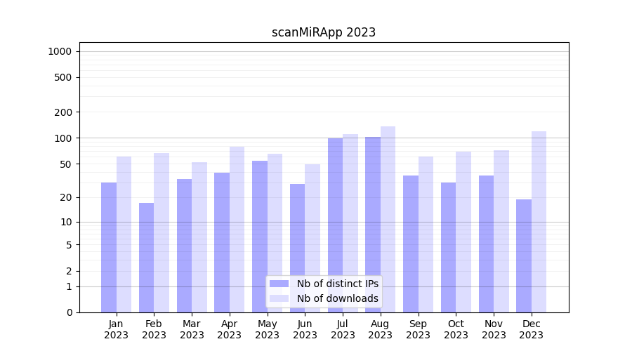 Number of downloads for software package scanMiRApp, year by year, from 2025 back to 2014 (years with no downloads are omitted):