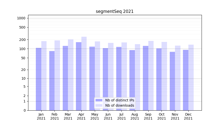 Number of downloads for software package segmentSeq, year by year, from 2025 back to 2014 (years with no downloads are omitted):