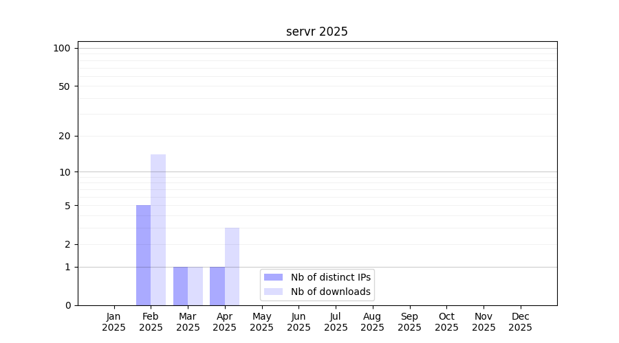 Number of downloads for software package servr, year by year, from 2025 back to 2014 (years with no downloads are omitted):