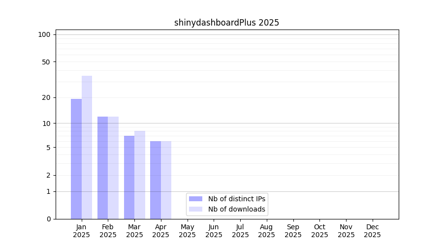 Number of downloads for software package shinydashboardPlus, year by year, from 2025 back to 2014 (years with no downloads are omitted):