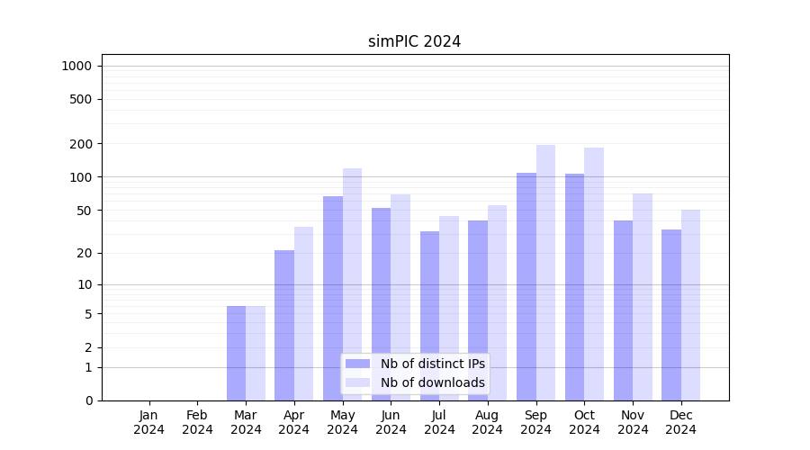 Number of downloads for software package simPIC, year by year, from 2025 back to 2014 (years with no downloads are omitted):