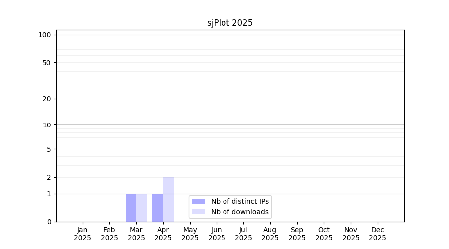 Number of downloads for software package sjPlot, year by year, from 2025 back to 2014 (years with no downloads are omitted):