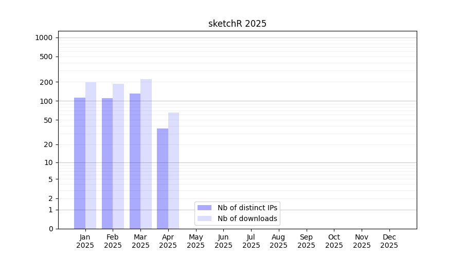 Number of downloads for software package sketchR, year by year, from 2025 back to 2014 (years with no downloads are omitted):