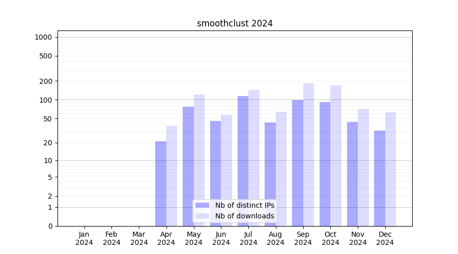 Number of downloads for software package smoothclust, year by year, from 2025 back to 2014 (years with no downloads are omitted):