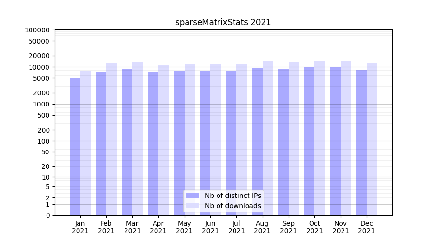 Number of downloads for software package sparseMatrixStats, year by year, from 2025 back to 2014 (years with no downloads are omitted):