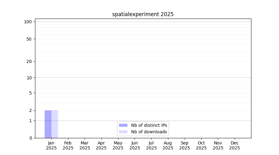 Number of downloads for software package spatialexperiment, year by year, from 2025 back to 2014 (years with no downloads are omitted):