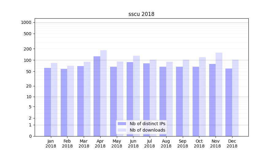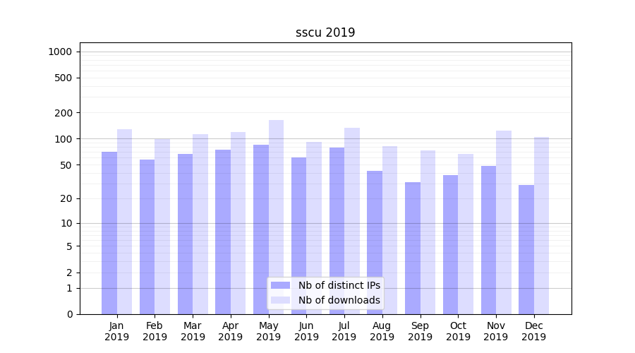 Number of downloads for software package sscu, year by year, from 2025 back to 2014 (years with no downloads are omitted):