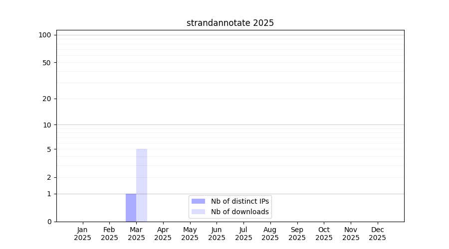 Number of downloads for software package strandannotate, year by year, from 2025 back to 2014 (years with no downloads are omitted):