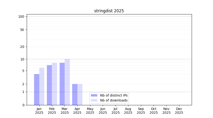 Number of downloads for software package stringdist, year by year, from 2025 back to 2014 (years with no downloads are omitted):