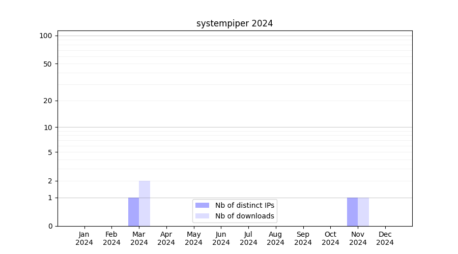 Number of downloads for software package systempiper, year by year, from 2025 back to 2014 (years with no downloads are omitted):