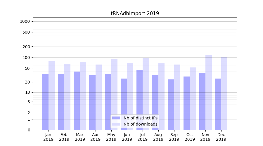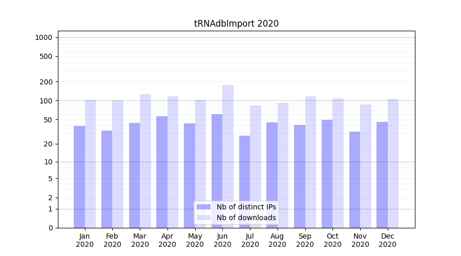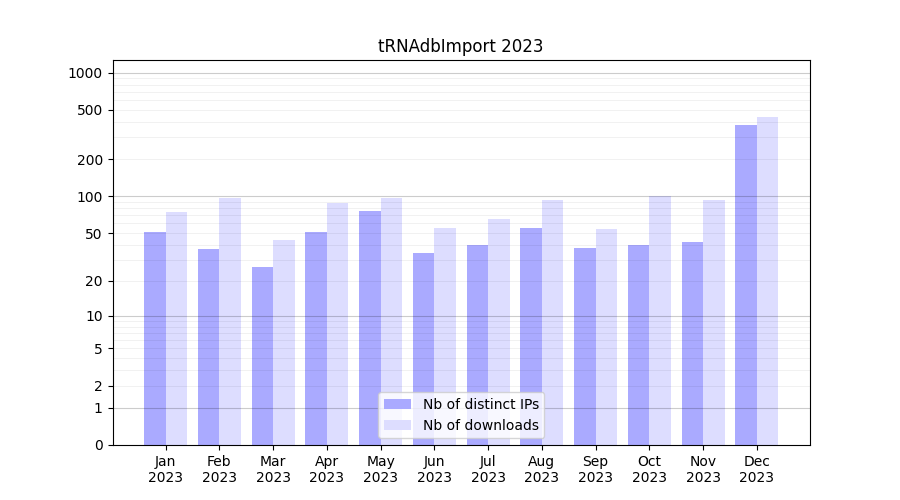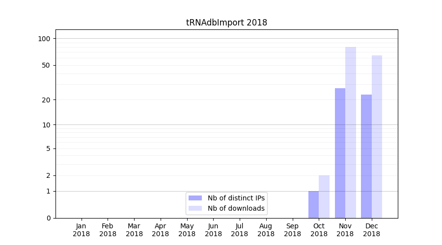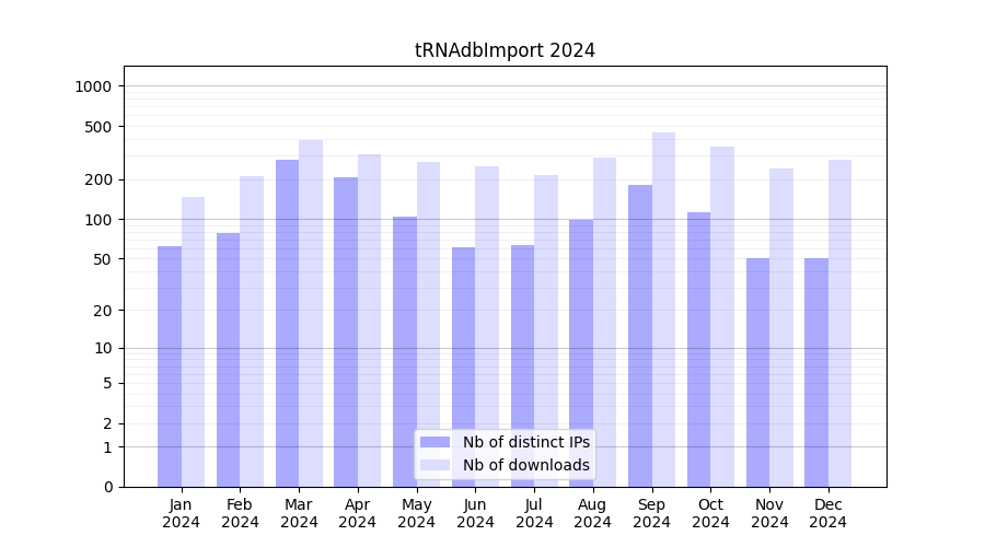 Number of downloads for software package tRNAdbImport, year by year, from 2025 back to 2014 (years with no downloads are omitted):