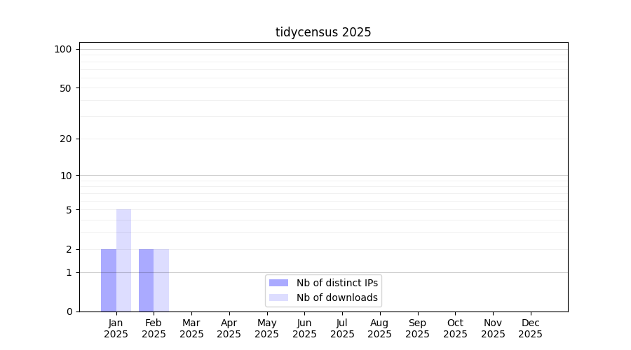 Number of downloads for software package tidycensus, year by year, from 2025 back to 2014 (years with no downloads are omitted):