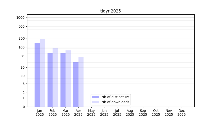 Number of downloads for software package tidyr, year by year, from 2025 back to 2014 (years with no downloads are omitted):