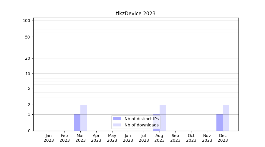 Number of downloads for software package tikzDevice, year by year, from 2025 back to 2014 (years with no downloads are omitted):