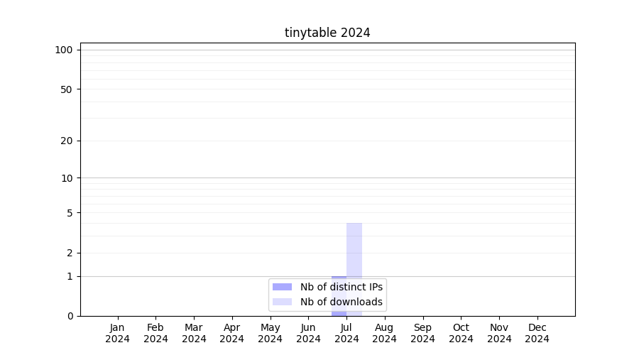 Number of downloads for software package tinytable, year by year, from 2025 back to 2014 (years with no downloads are omitted):