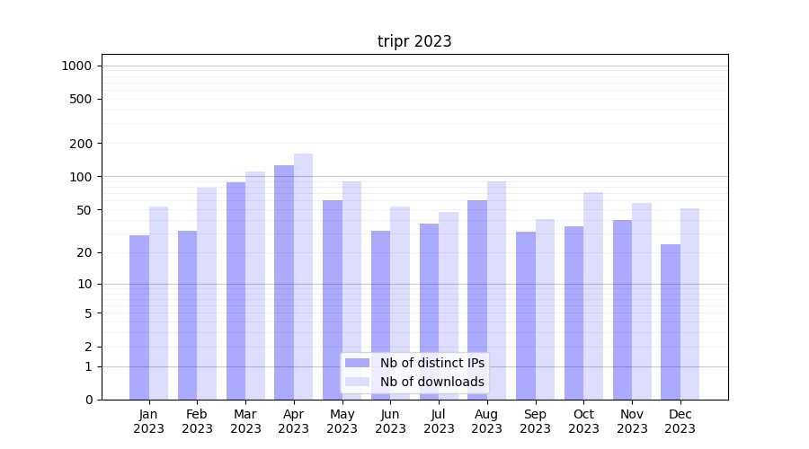 Number of downloads for software package tripr, year by year, from 2025 back to 2014 (years with no downloads are omitted):