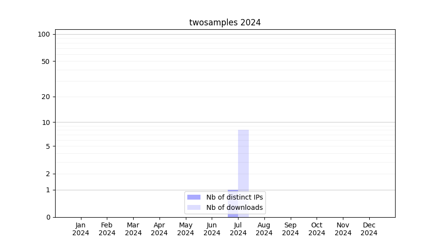 Number of downloads for software package twosamples, year by year, from 2025 back to 2014 (years with no downloads are omitted):