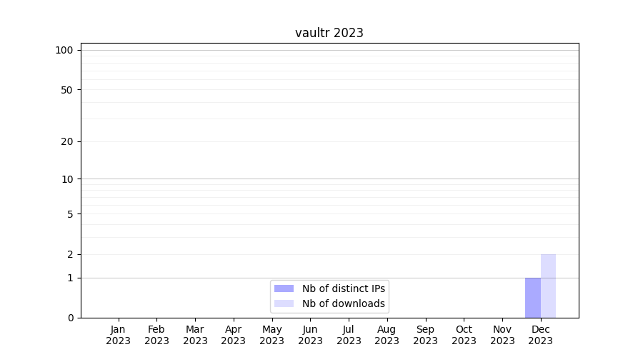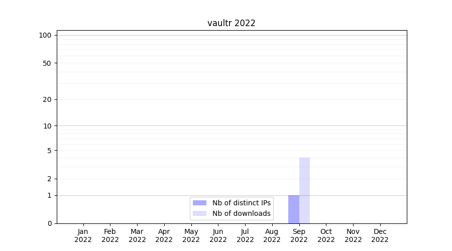 Number of downloads for software package vaultr, year by year, from 2025 back to 2014 (years with no downloads are omitted):