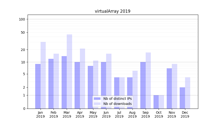 Number of downloads for software package virtualArray, year by year, from 2025 back to 2014 (years with no downloads are omitted):