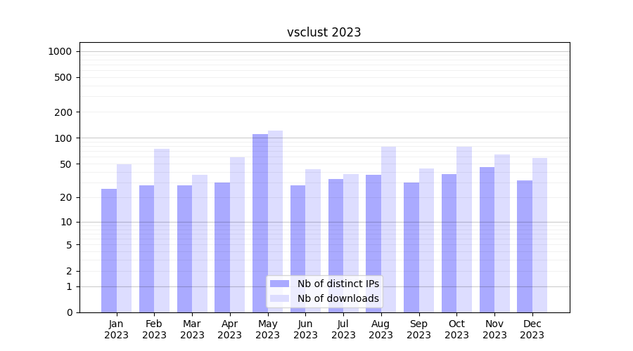 Number of downloads for software package vsclust, year by year, from 2025 back to 2014 (years with no downloads are omitted):
