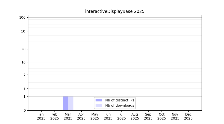 Number of downloads for annotation package interactiveDisplayBase, year by year, from 2025 back to 2014 (years with no downloads are omitted):