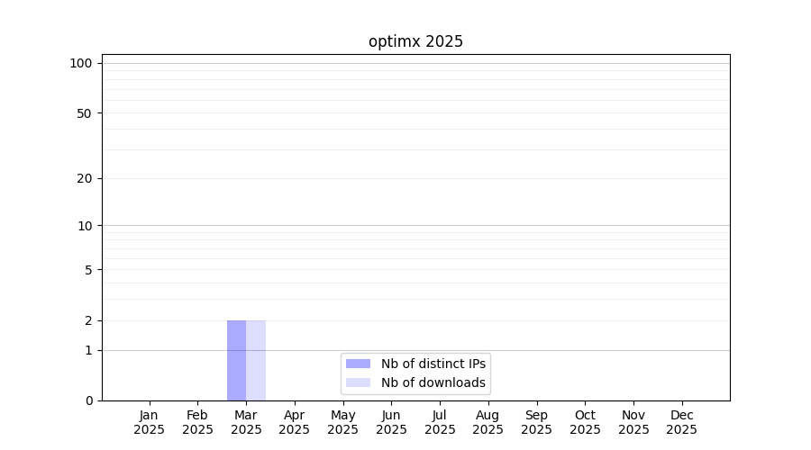 Number of downloads for annotation package optimx, year by year, from 2025 back to 2014 (years with no downloads are omitted):