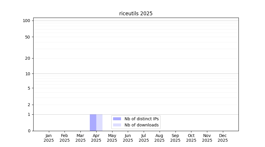 Number of downloads for experiment package riceutils, year by year, from 2025 back to 2014 (years with no downloads are omitted):