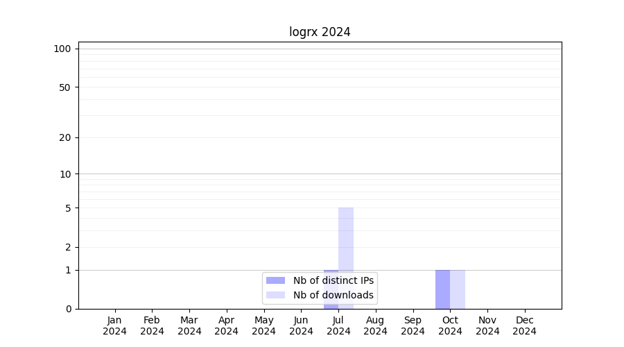 Number of downloads for workflow package logrx, year by year, from 2025 back to 2015 (years with no downloads are omitted):