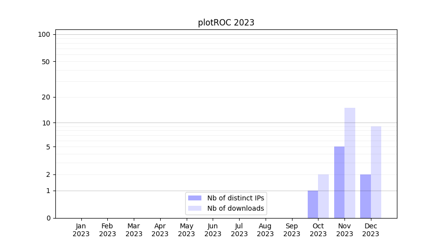 Number of downloads for workflow package plotROC, year by year, from 2025 back to 2015 (years with no downloads are omitted):