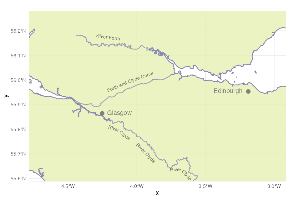 These geoms behave much the same way as geom_sf, except linestrings such as rivers and roads can be given (curved) text labels: