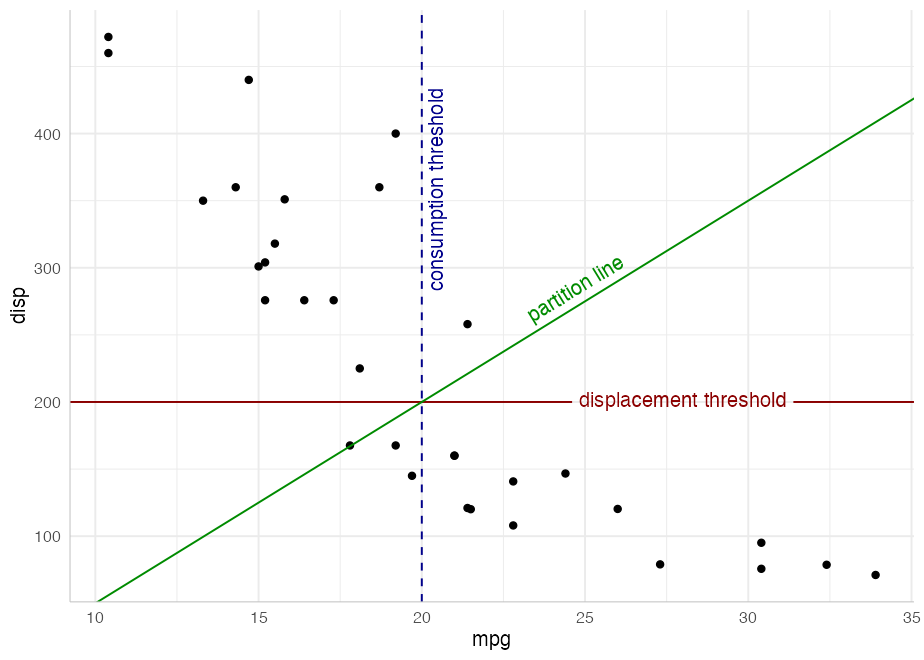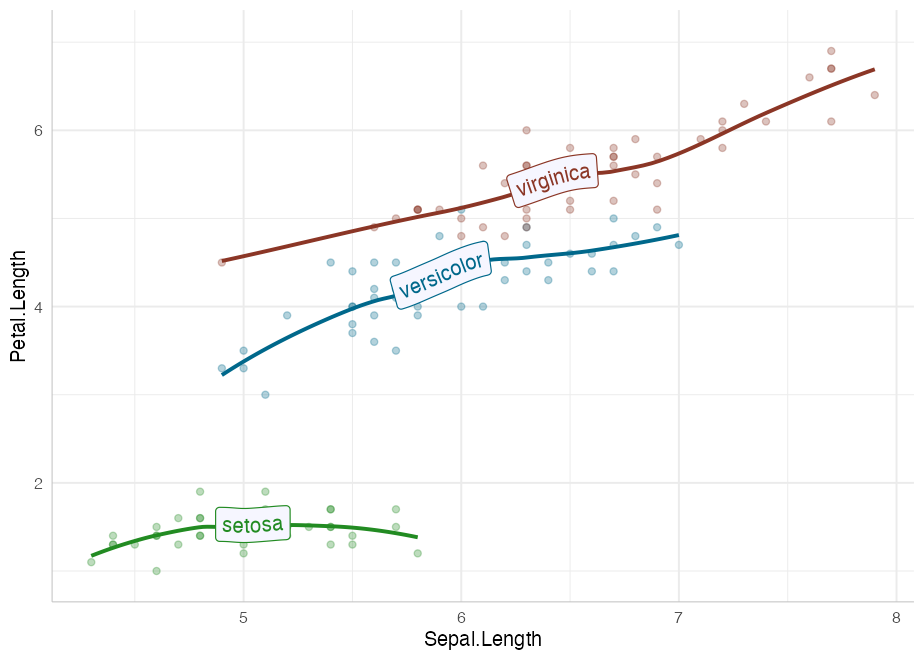Note that by design, we have not included the standard error ribbon in these geoms because the naming of the fill aesthetic would clash with the fill of the text boxes. If necessary, a standard geom_smooth can be drawn first to obtain the ribbon.