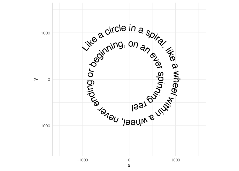 We have included the ability to have point-like text paths. While this sounds paradoxical, it means that geom_textpath can be used as a drop-in for geom_text, and will behave in much the same way, with the exception that the text will automatically curve in polar co-ordinates. Compare geom_textpath used in Cartesian co-ordinates:
