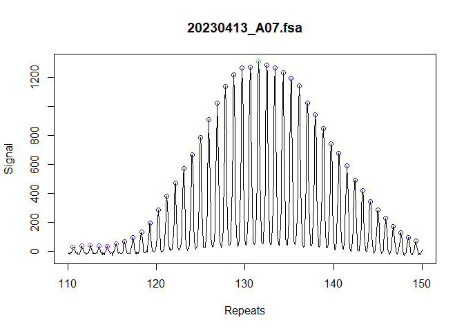 )We can validate that the index peaks were assigned correctly with a dotted vertical line added to the trace. This is perhaps more useful in the context of mice where you can visually see when the inherited repeat length should be in the bimodal distribution.