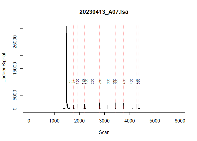 If starting from fsa files, the GeneScan™ 1200 LIZ™ dye Size Standard ladder assignment may not work very well. The ladder identification algorithm is optimized for GeneScan™ 500 LIZ™ or GeneScan™ 600 LIZ™ or other ladders with relatively few peaks. The 1200 LIZ™ ladder has a challenging pattern of ladder peaks to automatically assign. However, these ladders can be fixed by playing with the various parameters or manually with the built-in fix_ladders_interactive() app.